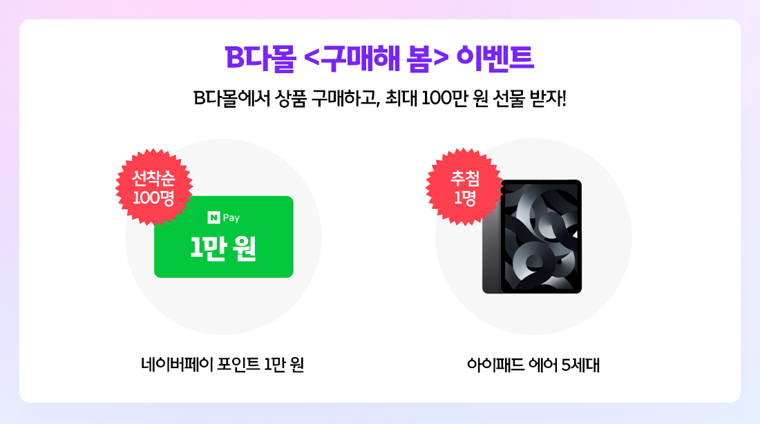 이벤트 기간 동안 B 다이렉트샵의 B다몰에서 상품을 구매하면 선착순 100분에게 네이버페이 포인트 1만 원을 드립니다!