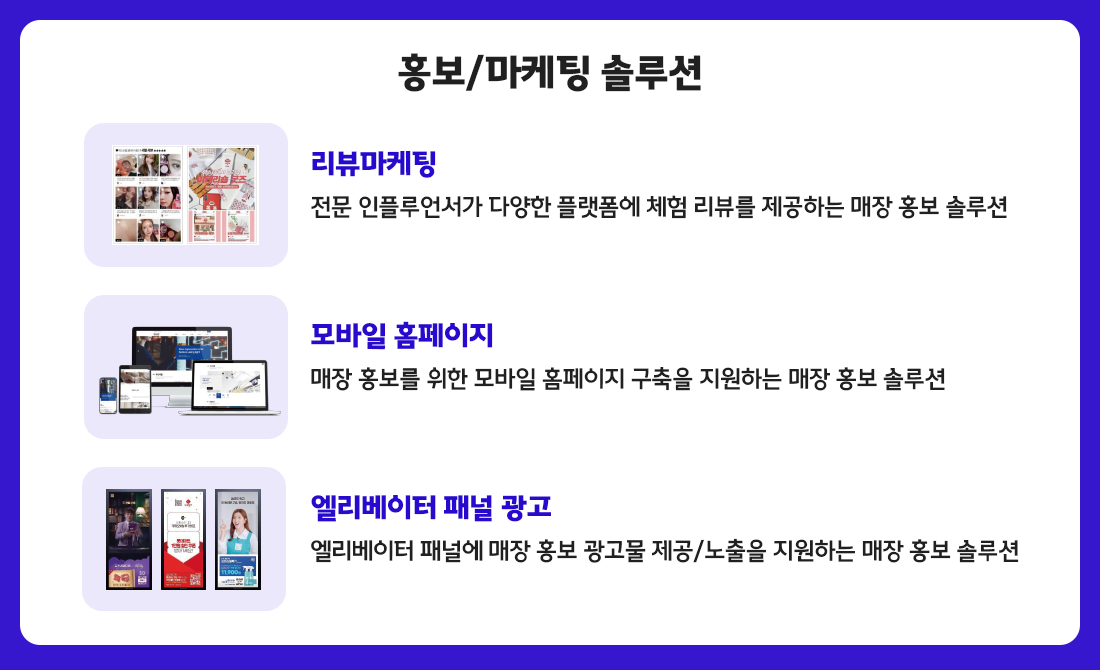 마지막으로 소개해 드릴 것은 ‘홍보/마케팅 솔루션’입니다. 아무리 좋은 가게라고 해도 많은 사람들이 알아야지만 꾸준하게 찾아 오겠죠?