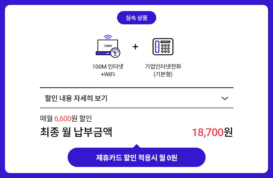 100M 인터넷부터 WiFi, 기업인터넷전화(기본형)까지 모두 사용 가능한 실속 상품은 월 18,700원입니다.