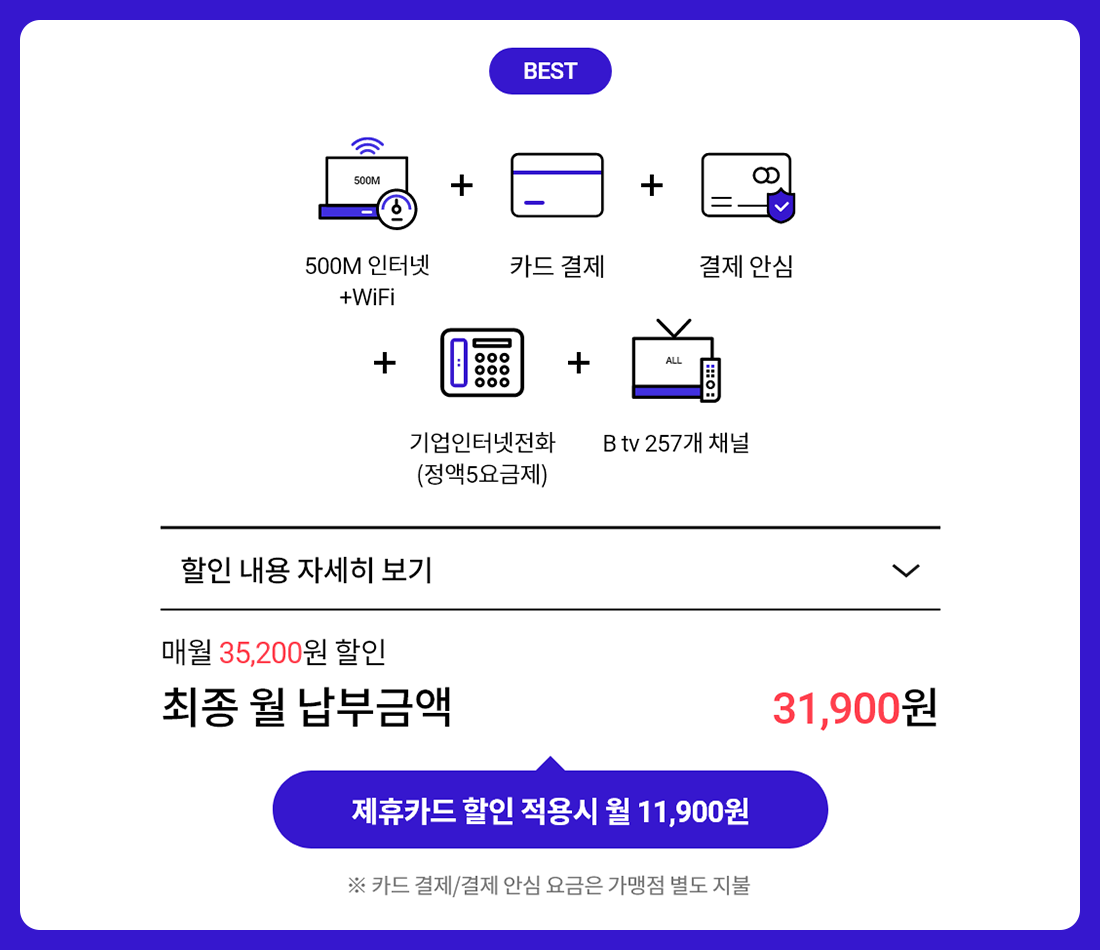 100M 인터넷 + WiFi, 카드 결제, 결제 안심, 기업인터넷전화(정액5요금제), B tv 257개 채널을
