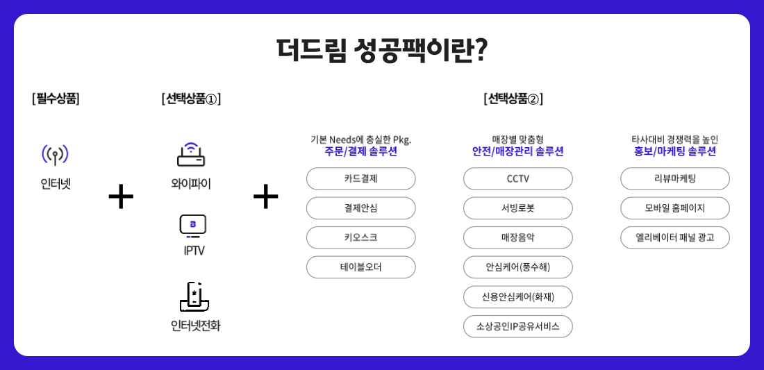 <더드림 성공팩>은 SK브로드밴드의 기본 상품인 인터넷, 와이파이, IPTV, 인터넷전화와 더불어