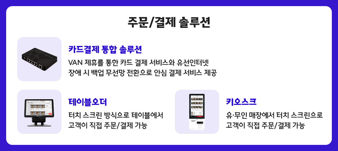 첫 번째는 ‘주문/결제 솔루션’입니다. 매출과 직결되는, 가장 기본적으로 갖추어져야 하는 솔루션인데요.