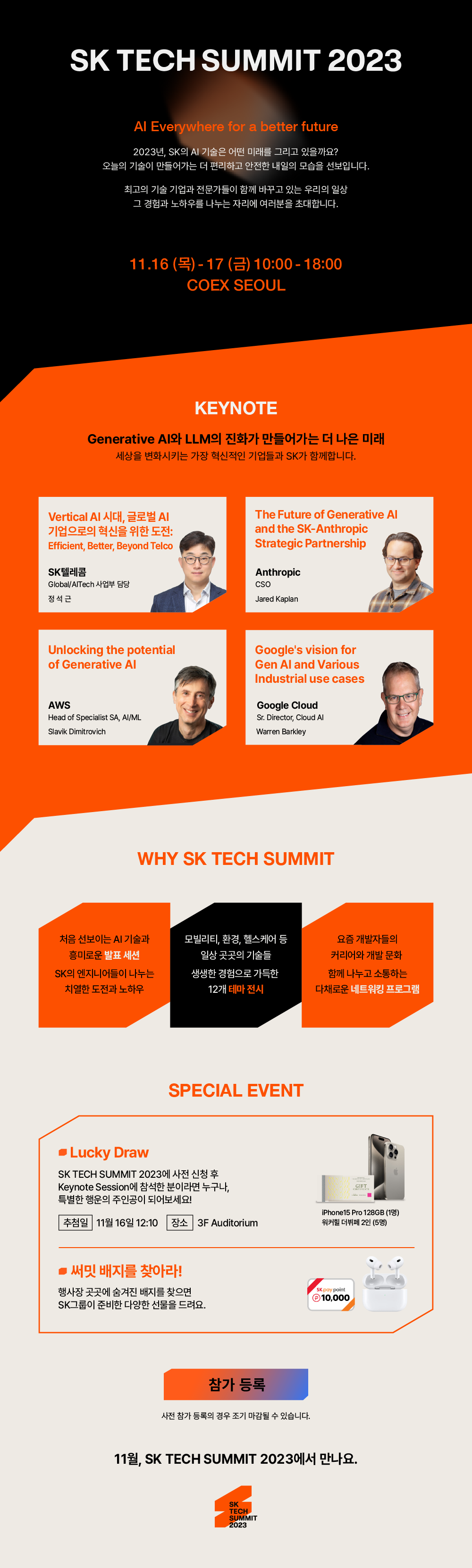 'SK 테크 서밋 2023'은 11월 16일 오전 유영상 SK ICT위원회 위원장의 생성형 AI가 촉발한 변화와 기회, 그리고 여기에 대응하는 SK의 AI 전략을 담은 오프닝 스피치를 시작으로 막을 연다. 이어 SKT 정석근 글로벌/AI Tech사업부 담당이 SKT의 AI 기술 개발 및 진화 방향에 대해 소개한다.
