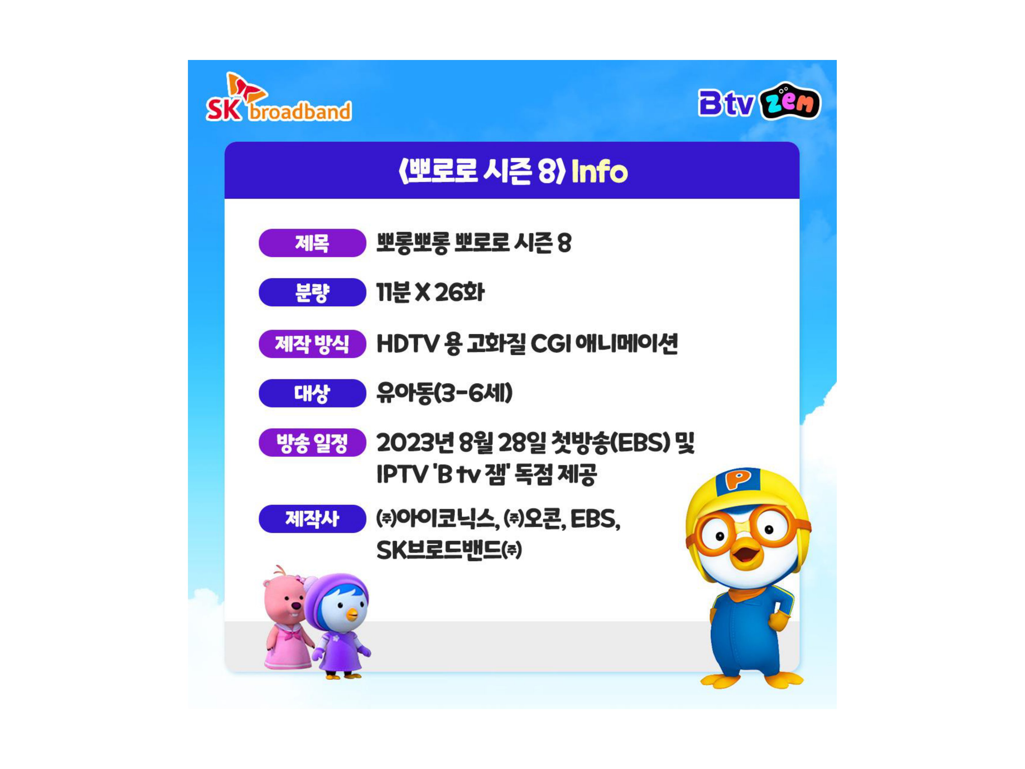 SK브로드밴드(사장 박진효, www.skbroadband.com)가 대한민국 대표 애니메이션뽀로로 8번째 시리즈뽀롱뽀롱 뽀로로 시즌 8’ B tv ZEM()에서 IPTV 최초 독점 제공한다고 27일 밝혔다.