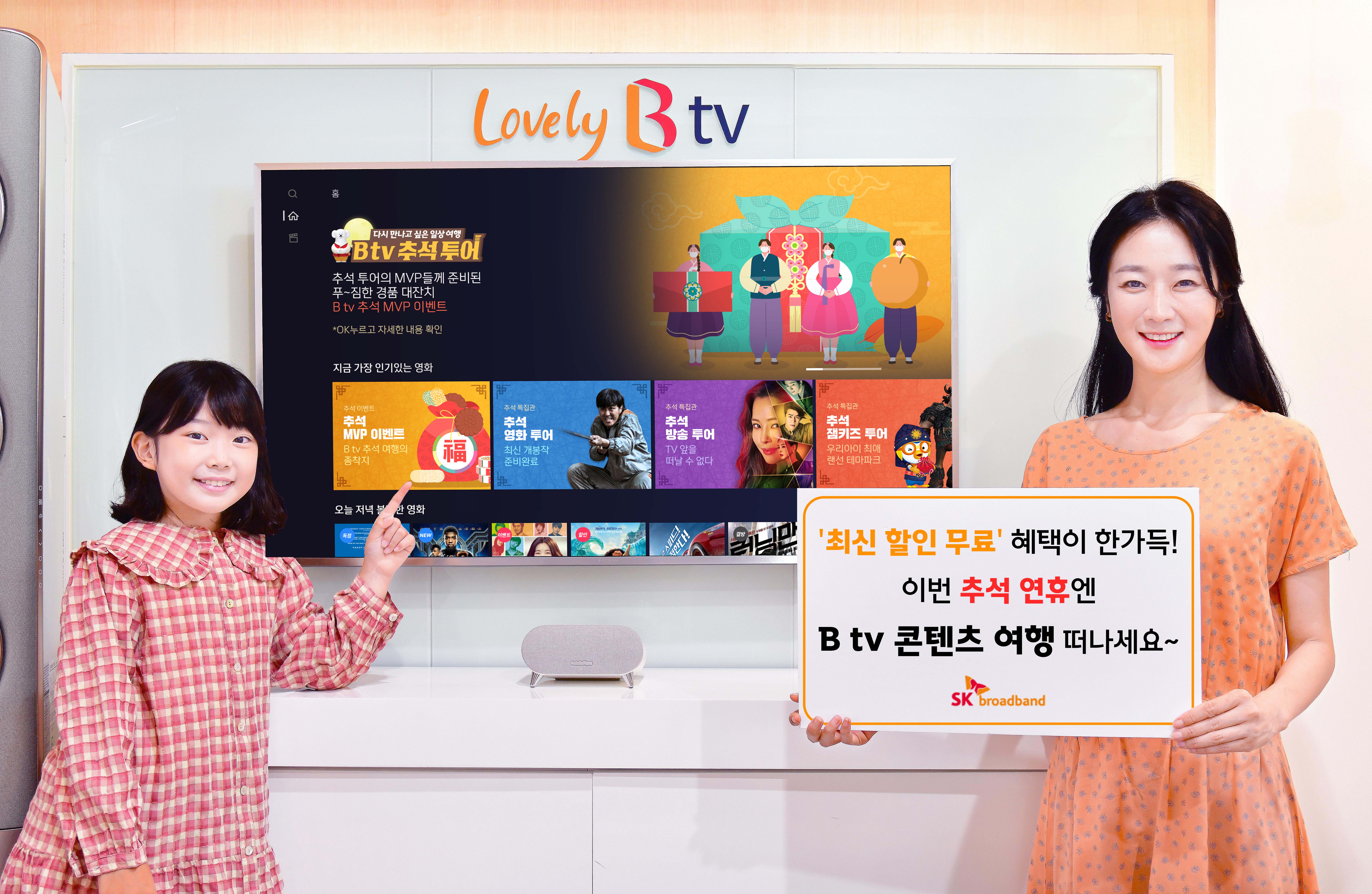 SK브로드밴드(대표이사 사장: 최진환, www.skbroadband.com)가 민족 대명절 추석을 맞아, 연휴 기간 B tv 콘텐츠를 부담 없이 즐길 수 있는 다양한 이벤트를 마련했다고 17일 밝혔다. 고객 맞춤 콘텐츠 제공, 각종 할인 혜택을 더해 코로나로 발이 묶인 고객들의 ‘B tv 콘텐츠 여행’을 지원한다.