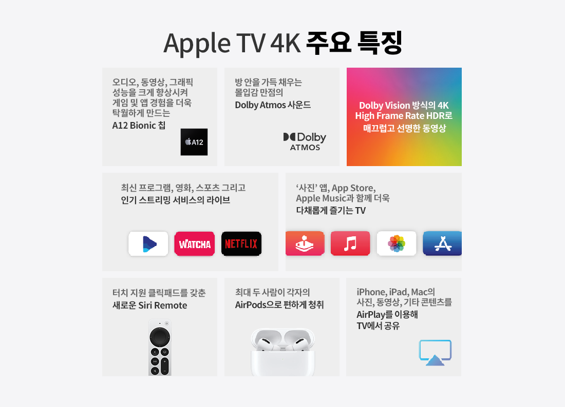 - Apple TV+는 물론, 넷플릭스, 왓챠, 웨이브 등 다양한 OTT 서비스를 이용해보세요