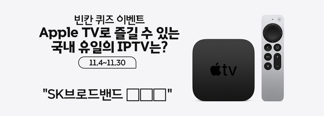 이제 Apple TV 4K로 즐길 수 있는 유일한 IPTV를 SK브로드밴드에서 만나보실 수 있습니다!