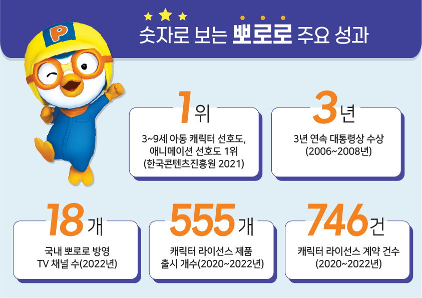 뽀로로는 수년간 영유아 국내 캐릭터·애니메이션 선호도 조사에서 1위를 이어가고 있고, 국내 300여개 라이선스 파트너사에서 5000여종의 관련 상품이 출시됐다. 해외 130여개국에서 방영돼 국산 애니메이션 사상 최다 판매 기록도 세웠다.