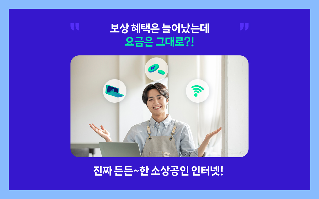 소상공인 맞춤형 인터넷 요금제로, 기존과 동일한 인터넷 요금으로 ‘소상공인 전용 보상 혜택’까지 제공하는 상품입니다.