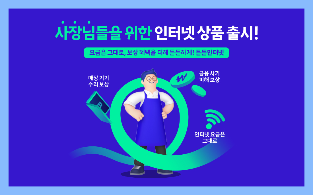 소상공인 맞춤형 인터넷 요금제로, 기존과 동일한 인터넷 요금으로 ‘소상공인 전용 보상 혜택’까지 제공하는 상품입니다.