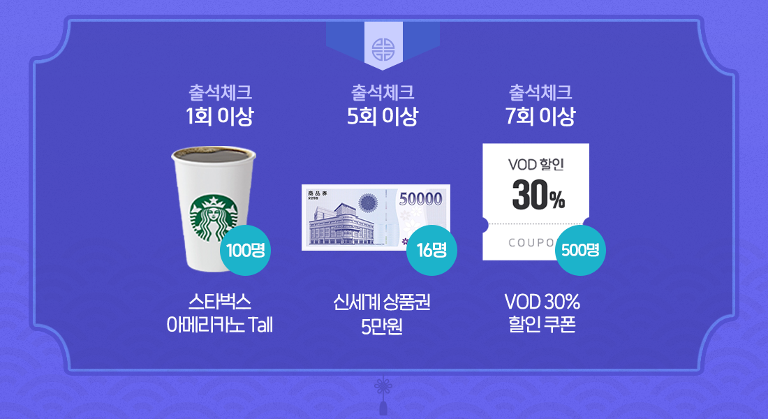 - 출석체크 7회 이상: VOD 30% 할인 쿠폰 500명