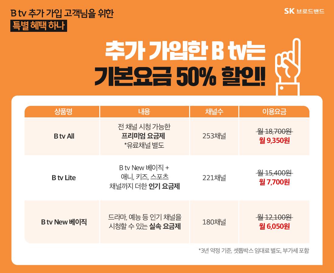 먼저 추가 가입한 B tv에 한해 기본요금을 무려 50%나 할인해드리는데요.