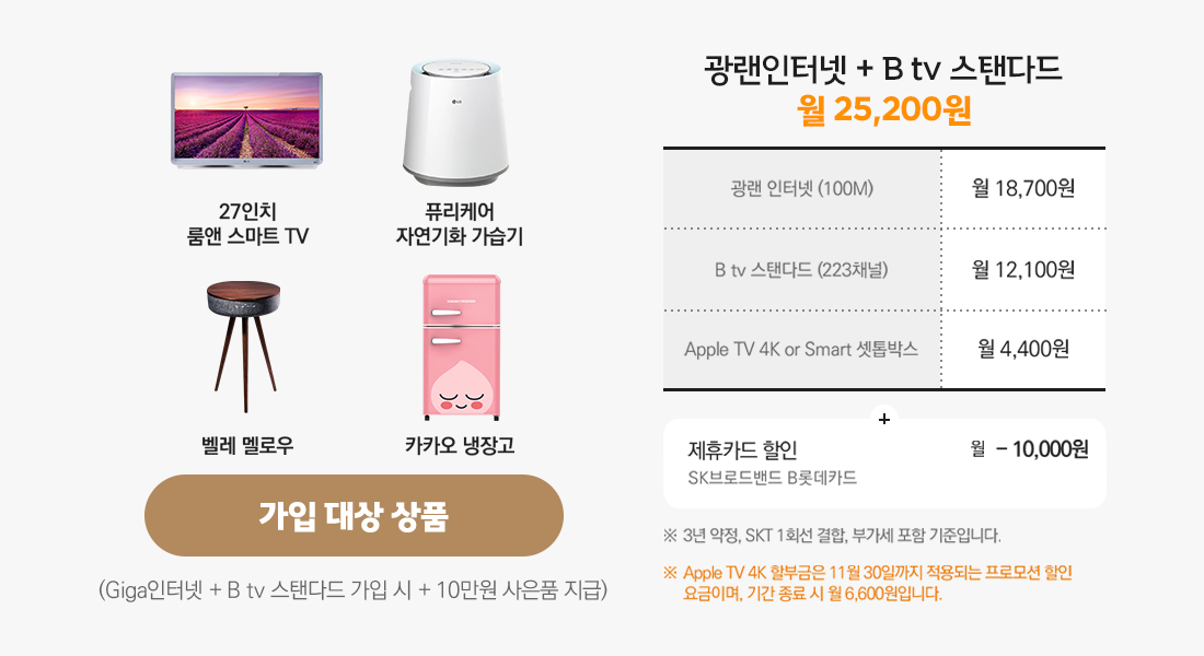 SK브로드밴드 B롯데카드 할인과 Apple TV 4K 프로모션은 동일하게 적용됩니다.
