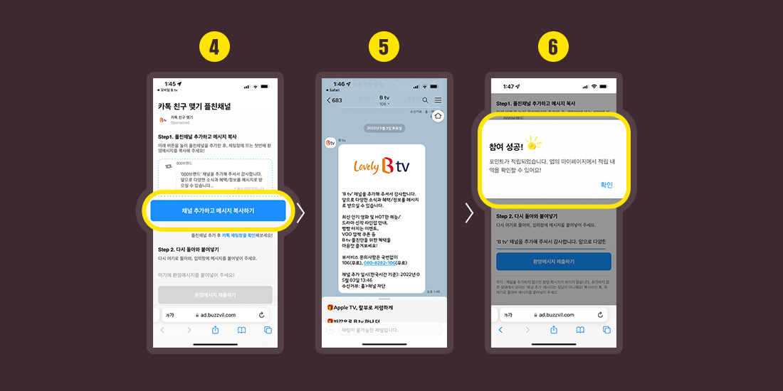 5. B tv 카카오톡 채널 추가 후 대화창에 전송된 환영메시지를 복사해주세요.