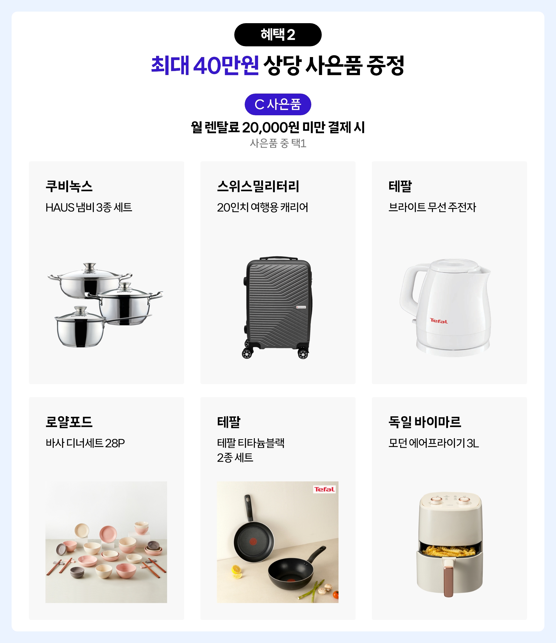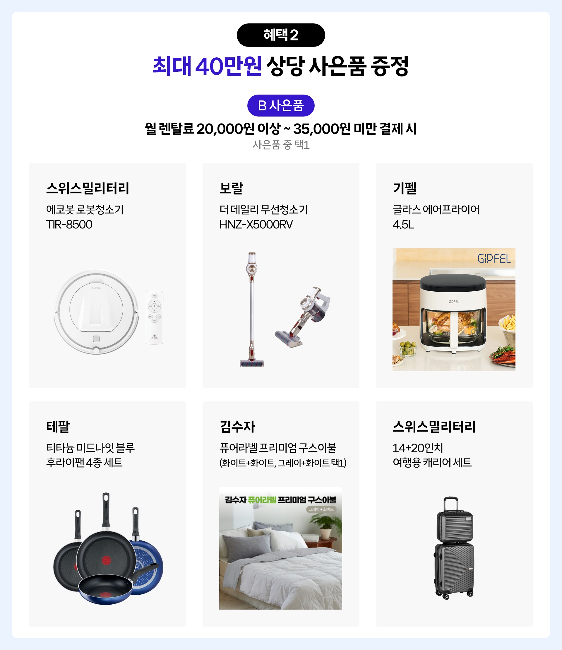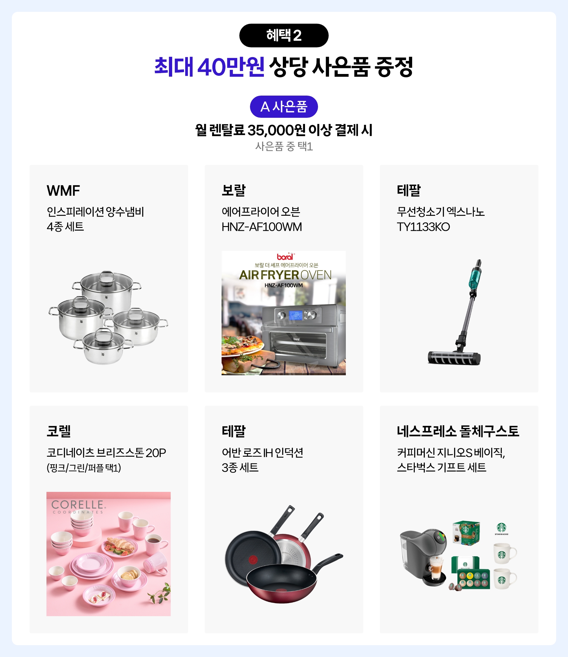 두 번째 혜택, 월 렌탈료에 따라 최대 40만 원 상당의 사은품을 받으실 수 있습니다!