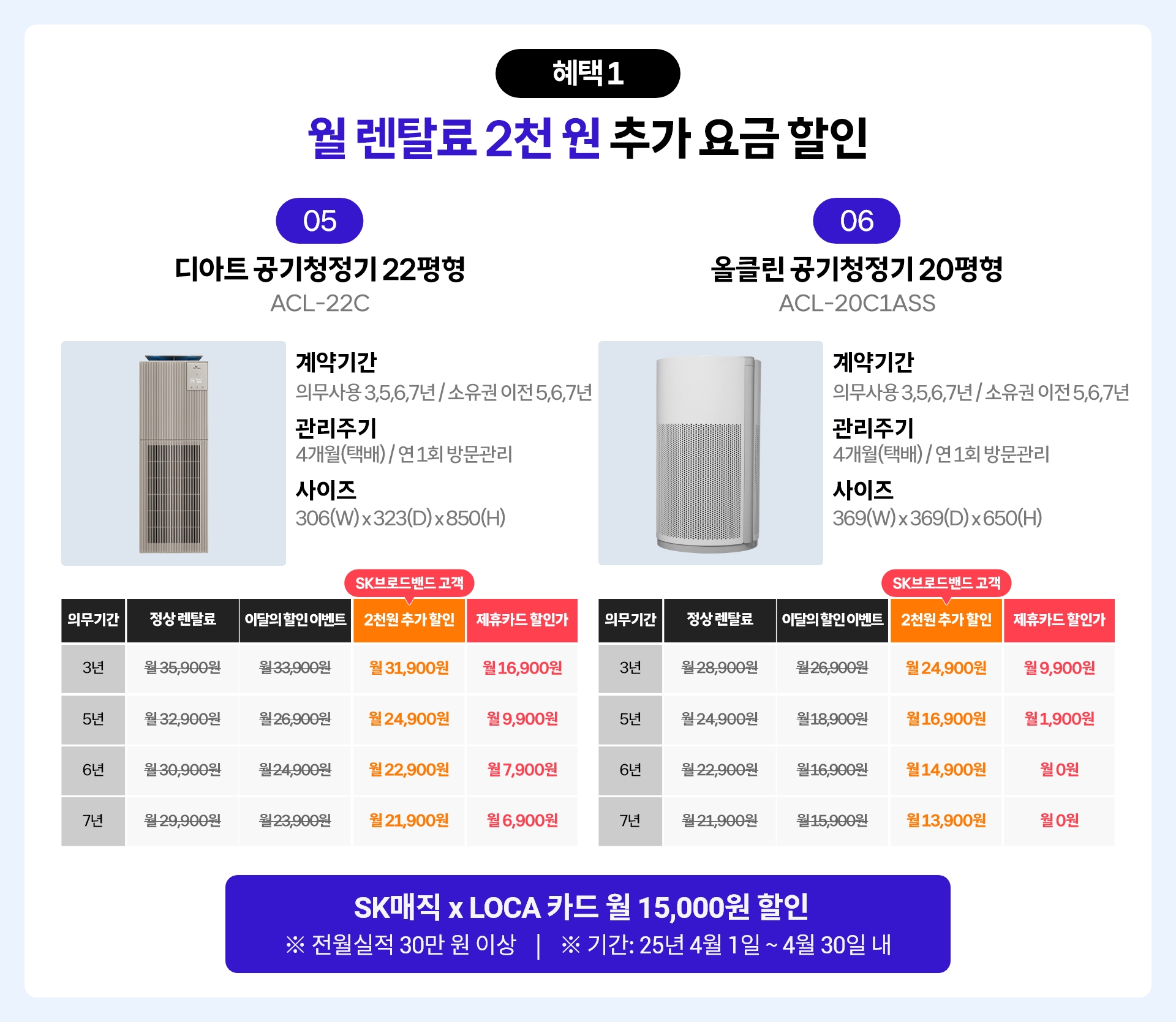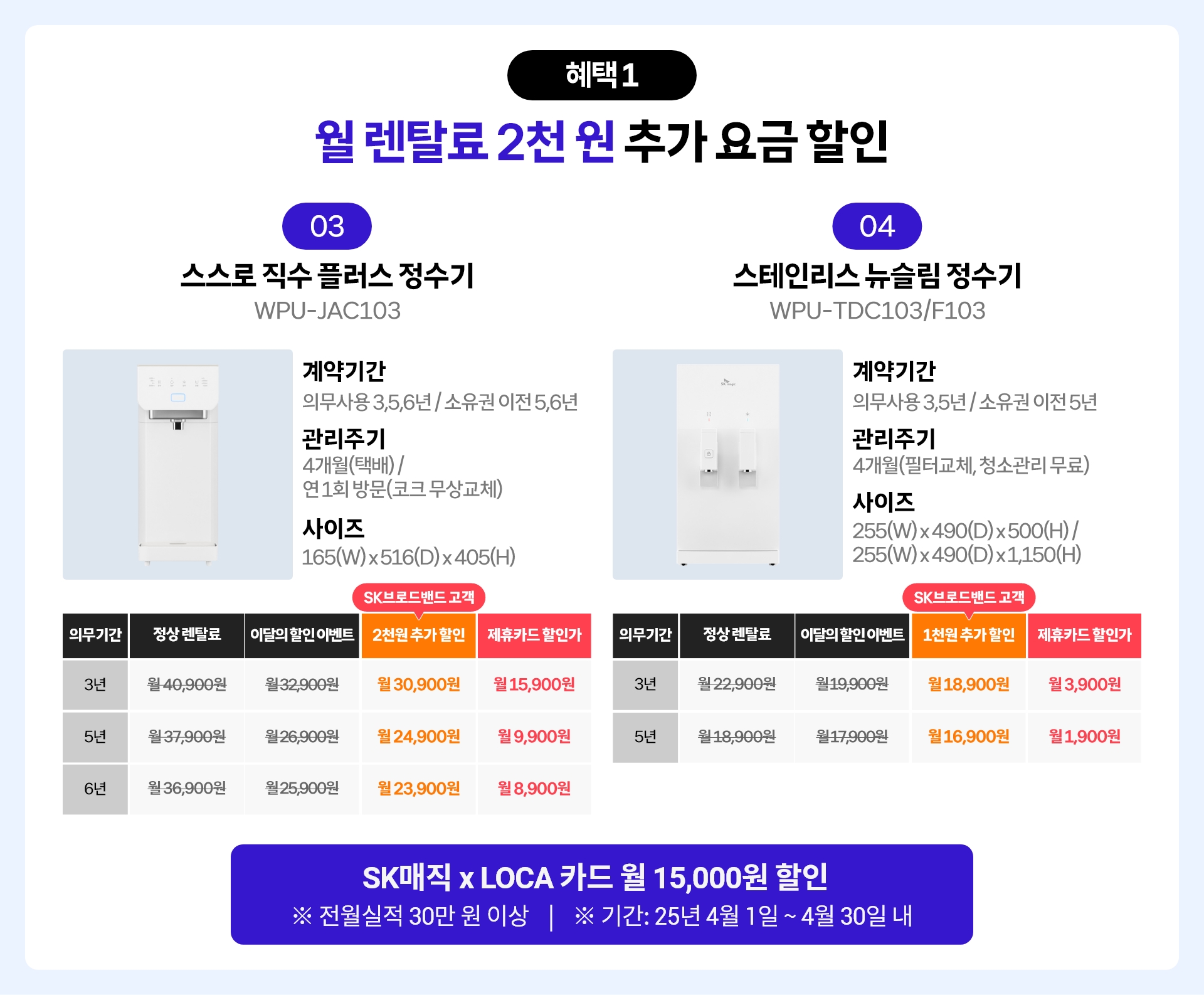 ※ 일부 제품의 경우 월 렌탈료 1천원 할인이 적용될 수 있습니다.