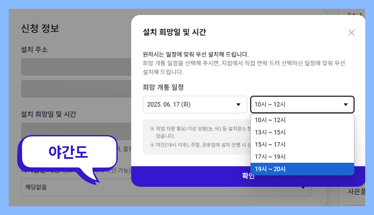 신청 정보 창이 뜨면 인터넷 설치를 원하는 주소를 적고, 설치 희망일과 시간을 고르실 수 있습니다.