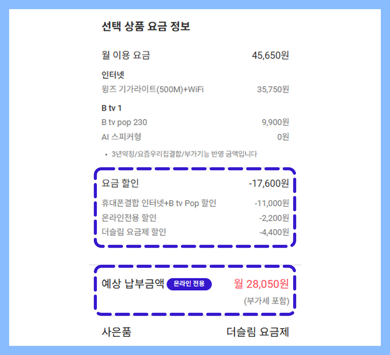 선택한 상품의 월 예상 납부 금액과 선택한 옵션에 따른 할인 요금을 확인할 수 있어요.