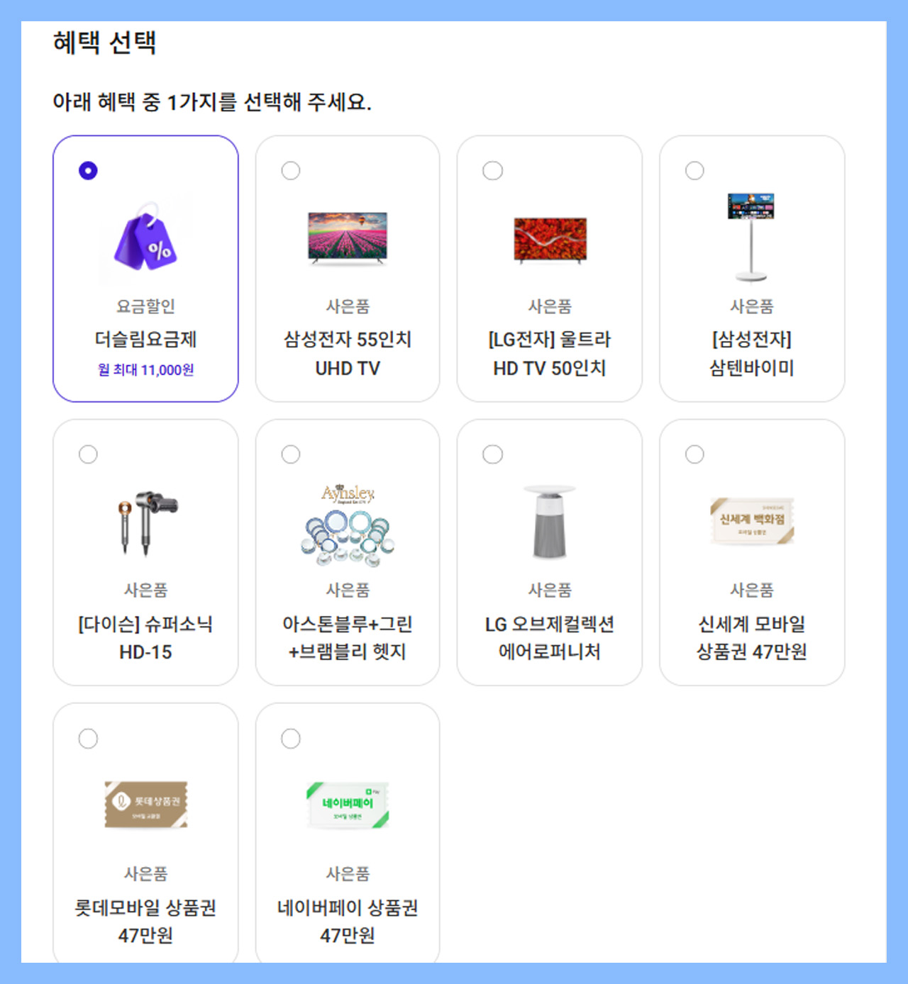 신규 가입 시 사은품을 직접 비교해보고 가장 원하는 상품으로 선택할 수 있다는 점!