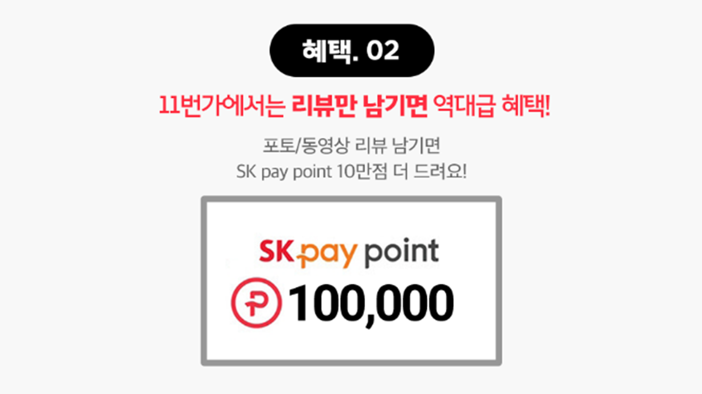 포토 리뷰 혹은 동영상 리뷰를 남기면 5월 중순 SK pay point 10만점을 받을 수 있다고 합니다.