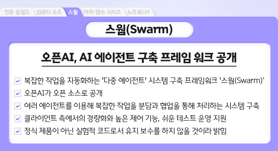1. Summary: 오픈AI가 복수의 전문 인공지능(AI) 에이전트를 연계해 복잡한 작업을 자동화하는 '다중 에이전트' 시스템 구축 프레임워크인 '스웜(Swarm)'을 오픈 소스로 공개했다.