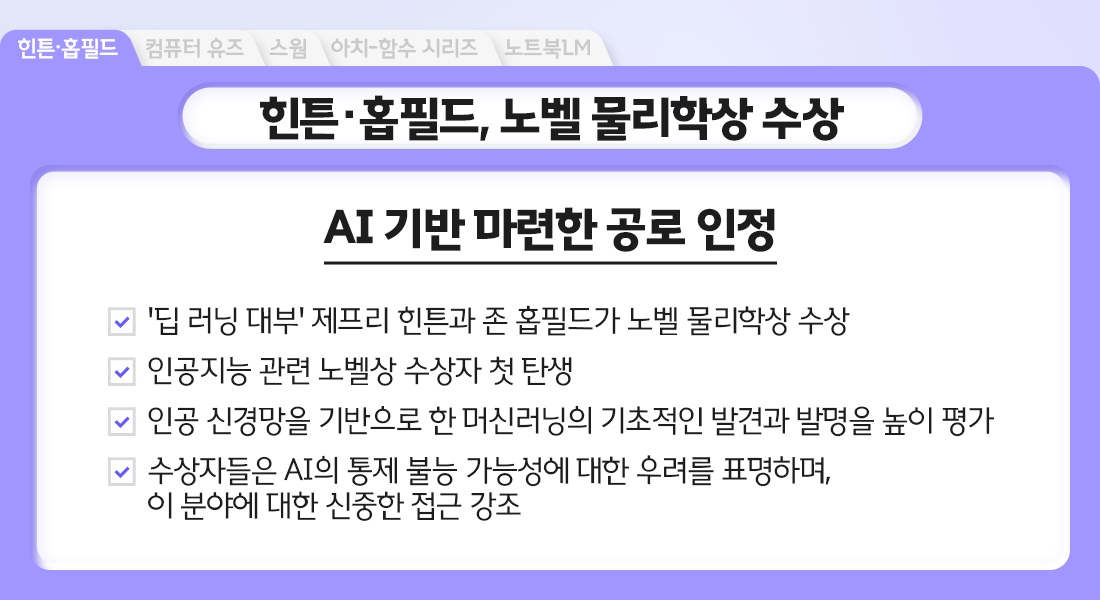 1. Summary: 2024년 노벨 물리학상은 제프리 힌튼과 존 홉필드에게 돌아가, 인공지능 관련 노벨상 수상자가 처음으로 탄생했다.