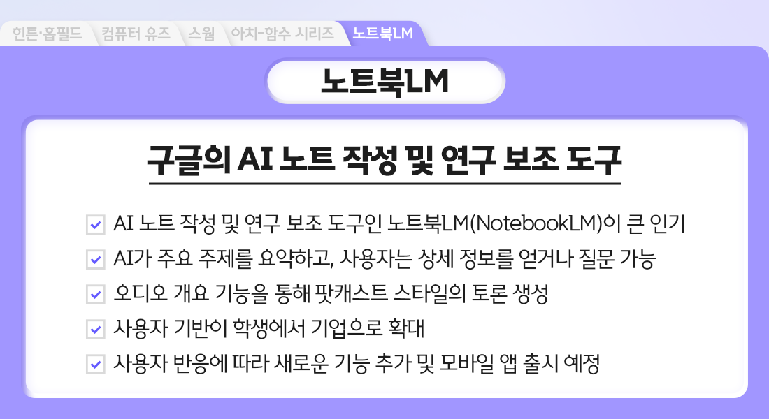 1. Summary: ‘공부 노트’로 유명한 구글의 AI 노트 작성 및 연구 보조 도구인 ‘노트북LM(NotebookLM)’이 큰 인기를 얻고 있다.