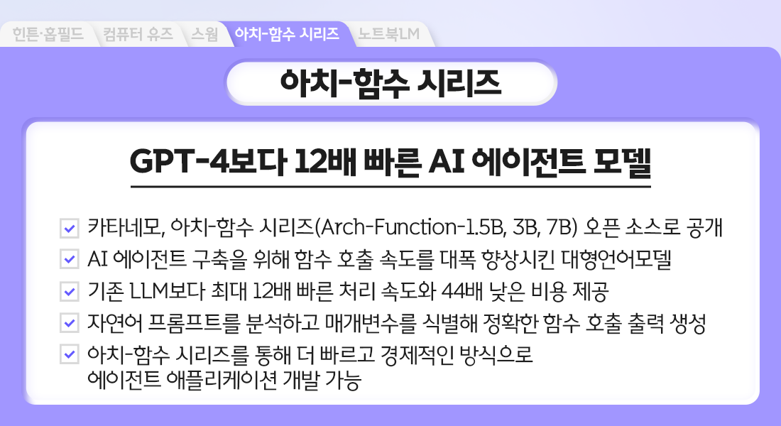 1. Summary: 인공지능 스타트업 카타네모가 AI 에이전트 구축을 위해 함수 호출 속도를 대폭 향상시킨 대형언어모델(LLM)인 아치-함수 시리즈(Arch-Function-1.5B, 3B, 7B)를 오픈 소스로 공개했다.