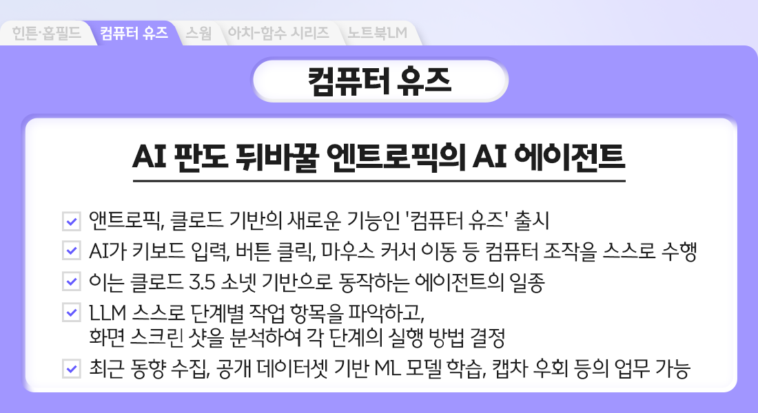 1. Summary: 앤트로픽은 클로드 기반의 새로운 기능인 ‘컴퓨터 유즈’를 출시했다.