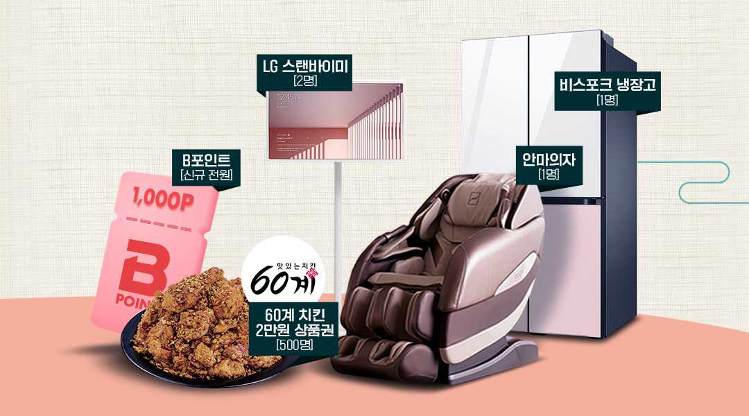 60계 치킨 2만원 상품권 (500명), B포인트 1,000P (신규 홈 설정 고객 전원)