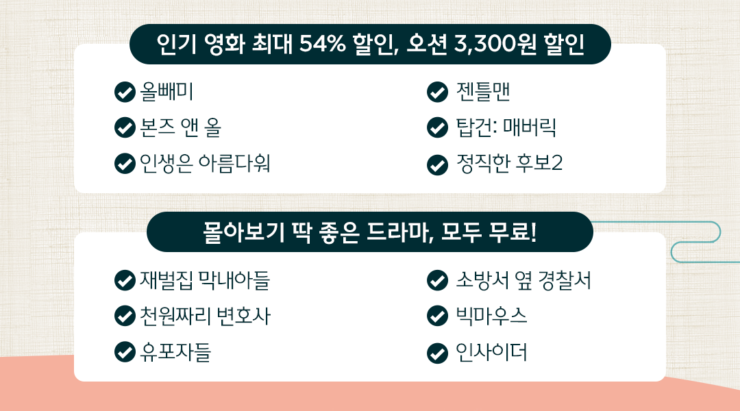 인기 영화 할인과 OCEAN 할인, 무료 드라마 등 다양한 콘텐츠를 즐겨볼까요?