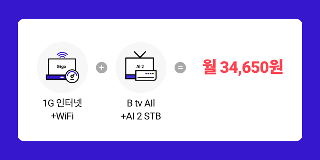 1G 인터넷(기가인터넷) + WiFi(기가와이파이)와 B tv All(257개 채널) + AI2 셋톱박스를 다 더해도 월 34,650원에 이용하실 수 있습니다. (3년 약정 기준)