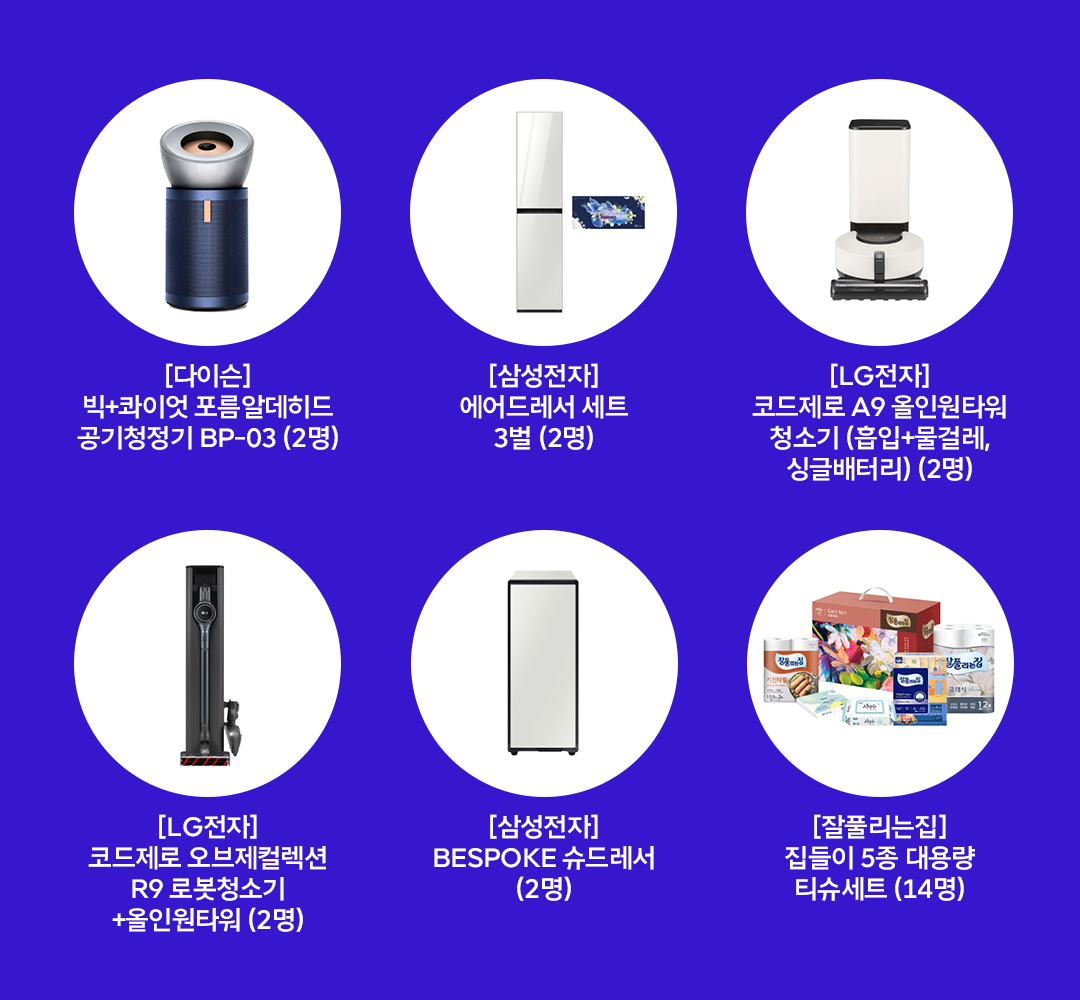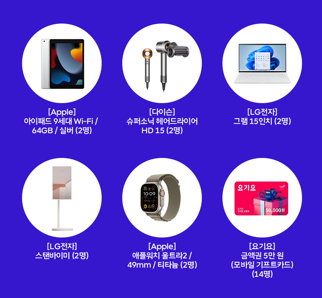 다이슨 공기청정기, LG 스탠바이미, 애플워치, 아이패드 등 푸짐한 경품도 있답니다~