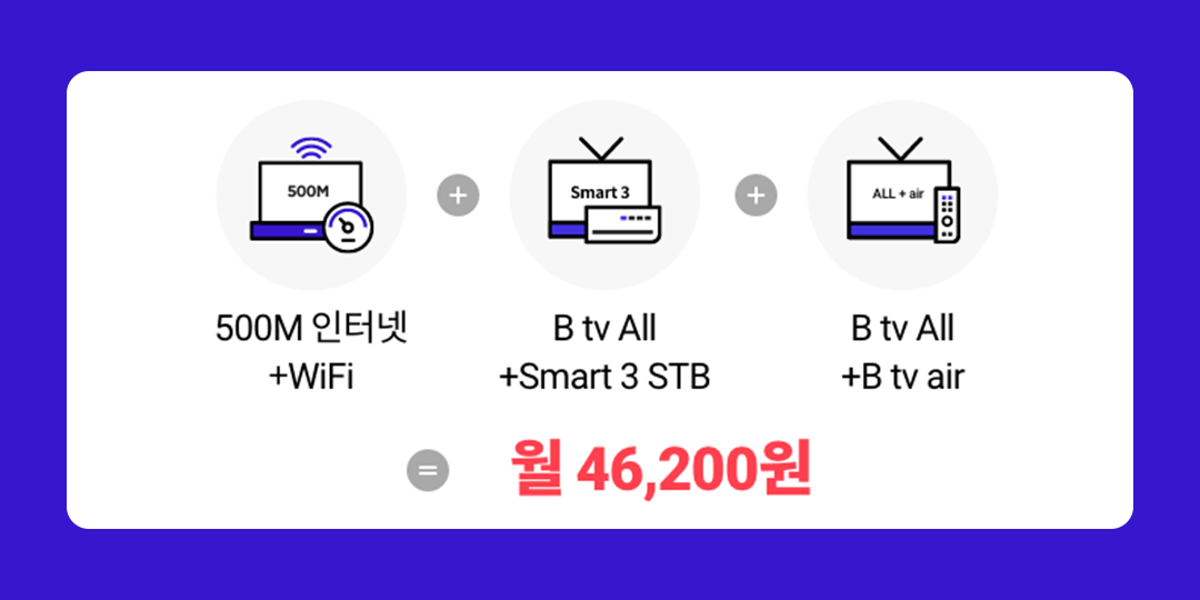 500M 인터넷(기가라이트인터넷) + WiFi(기가와이파이)와 B tv All(257개 채널) + Smart3 셋톱박스에