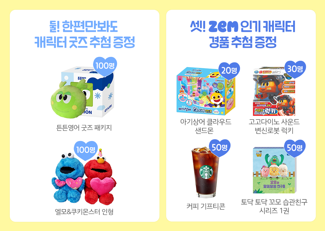 아기상어 클라우드 샌드몬 (20명), 고고다이노 럭키 로봇 (30명), 커피 기프티콘 (50명),