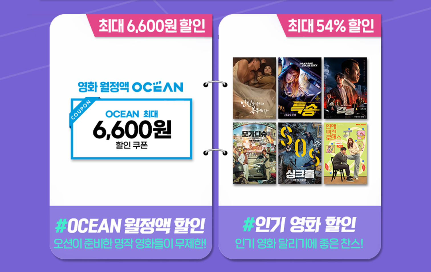 준비된 명작 영화를 무제한으로 볼 수 있는 #OCEAN 월정액 최대 6천원 할인은 기본!