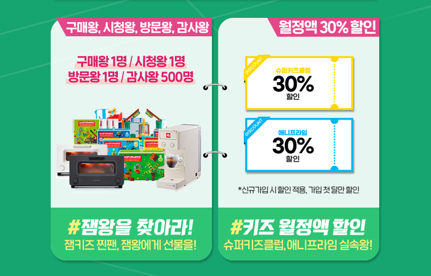 여기에 더해 슈퍼키즈클럽과 애니프라임 등 #키즈 월정액 신규가입 시 첫 달 30% 할인 혜택까지!