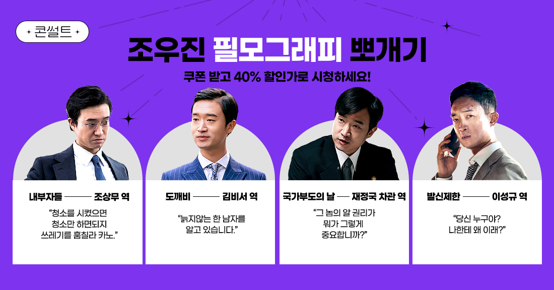 지금 B tv에서 <내부자들>의 조상무, <도깨비>의 김비서, <국가부도의 날>의 재정국 차관, <발신제한>의 이성규 등 조우진 배우 출연작 전용 40% 할인 쿠폰으로 할인 받고 작품 감상하세요!