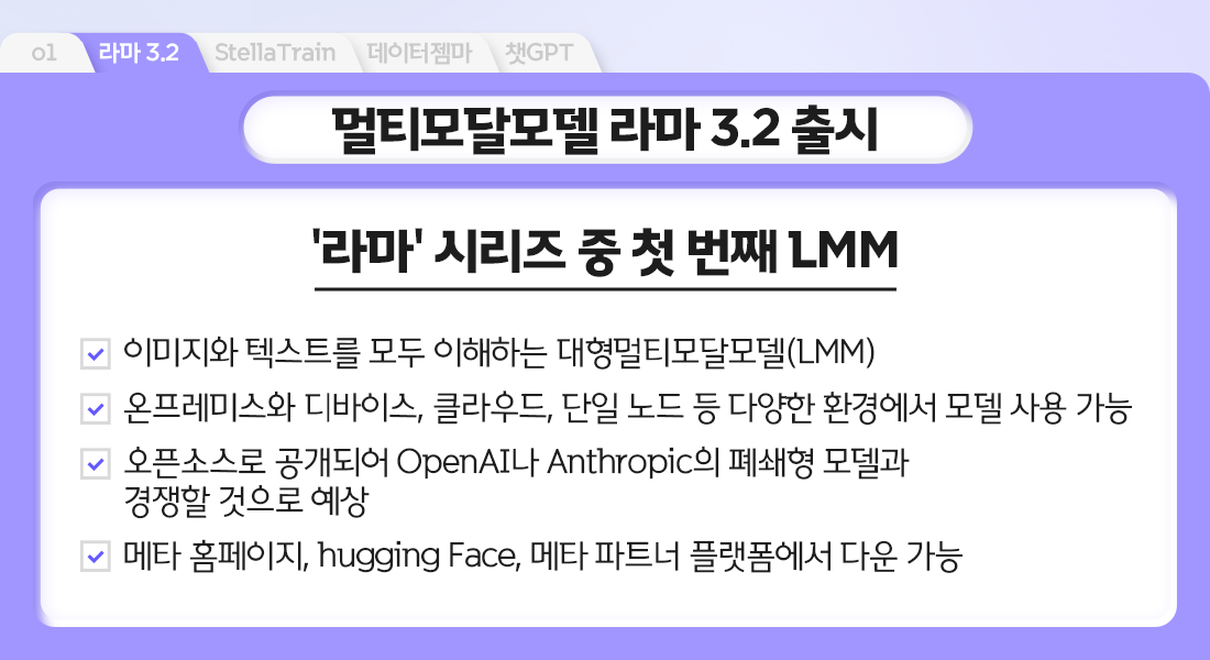 1. Summary: 메타가 '라마' 시리즈 중 이미지와 텍스트를 모두 이해하는 첫번째 대형멀티모달모델(LMM)을 출시했다.