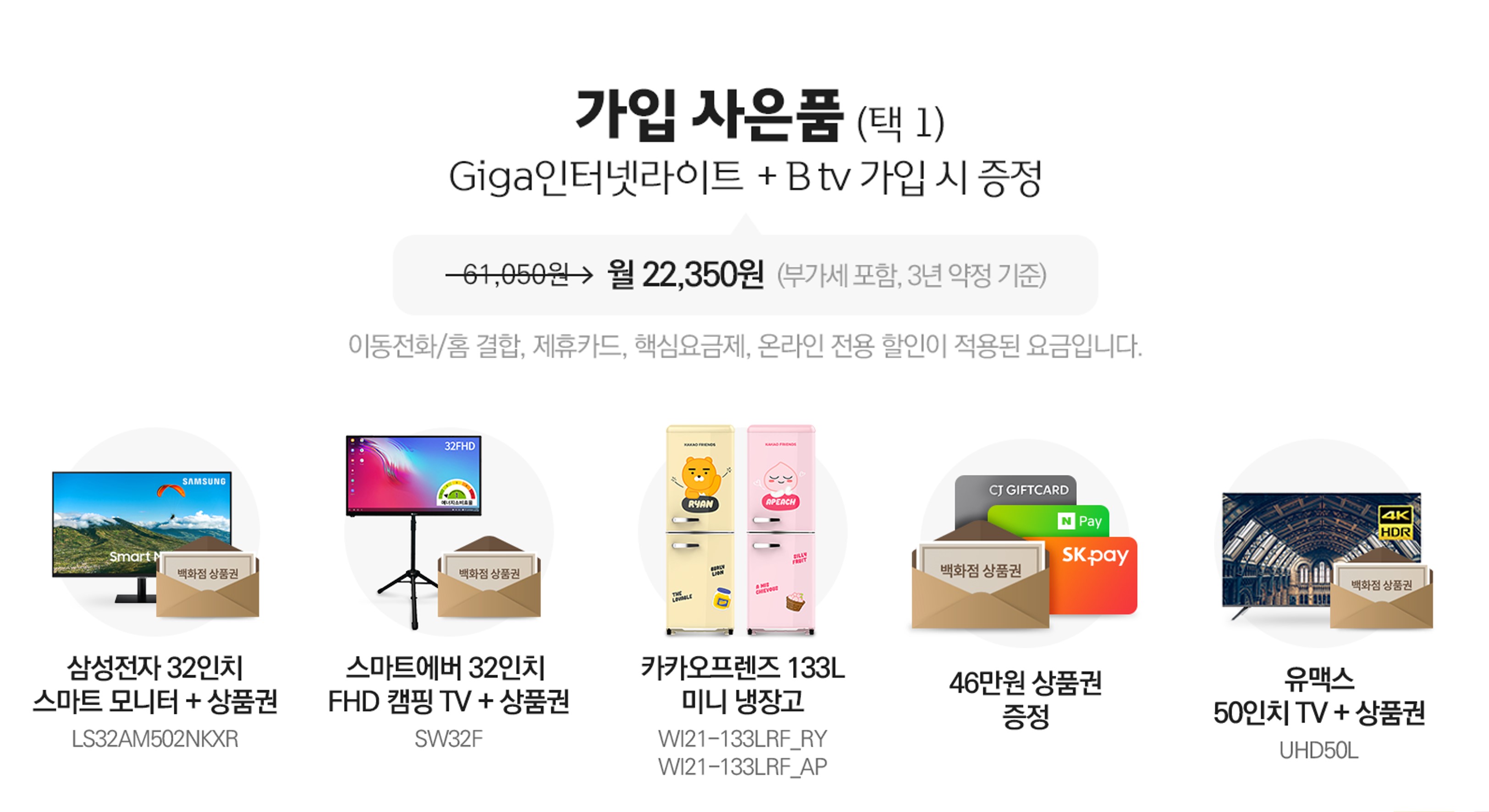Giga인터넷라이트와 B tv에 신규 가입하시면 월 61,050원에서 약 4만원이 할인된 월 22,350원의 저렴한 가격에 인터넷과 IPTV를 즐기고, 사은품도 선택할 수 있습니다. (부가세 포함, 3년 약정 기준)