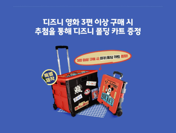 대상 콘텐츠를 3편 이상 구매하시면 특별 제작된 굿즈인 디즈니 폴딩 카트에 도전해보실 수 있는데요. 디즈니 덕후라면 못 참죠! 추첨을 통해 미키 폴딩 카트를 증정하는 이벤트도 놓치지 마세요.