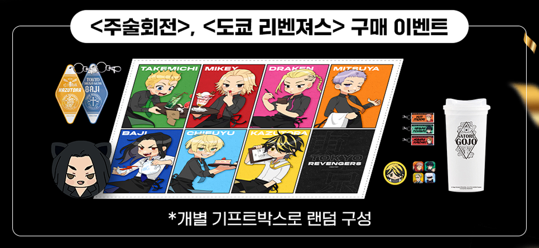 <주술회전>과 <도쿄 리벤져스>를 1편 이상 구매하시면 추첨을 통해 랜덤 굿즈 기프트박스를 드려요!