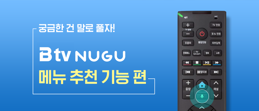 B tv 고객이라면 리모컨을 통해 인공지능 서비스 NUGU를 즐길 수 있는 B tv NUGU.