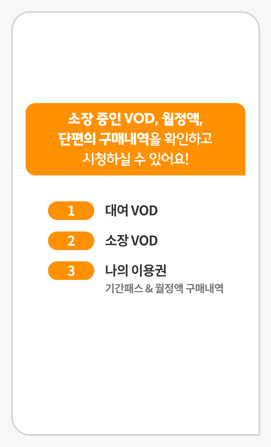 소장 중인 VOD, 월정액, 단편의 구매내역을 확인하고 시청하실 수 있어요!