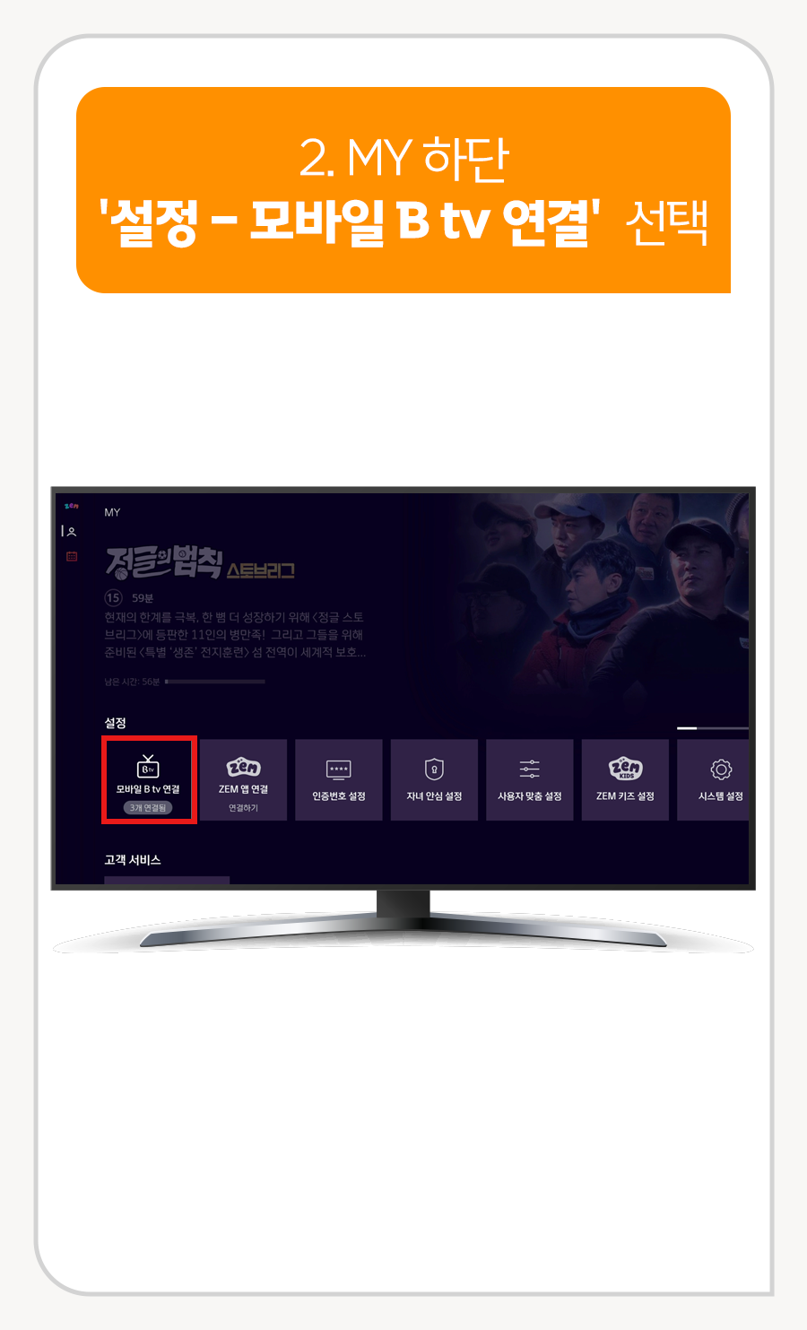 2. [MY] 하단 [설정] ▶ [모바일 B tv 연결] 선택