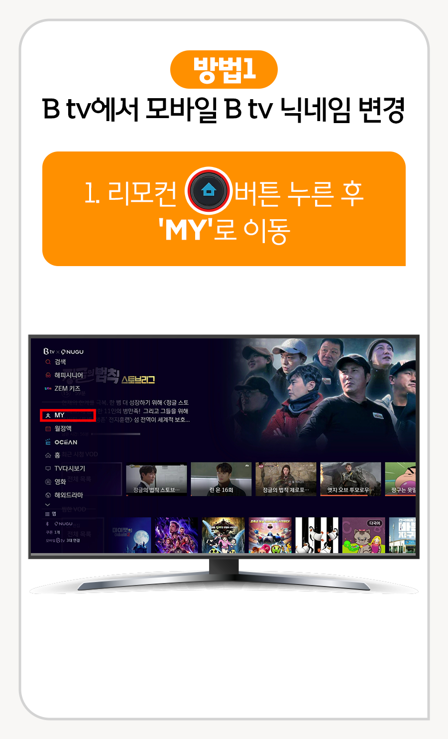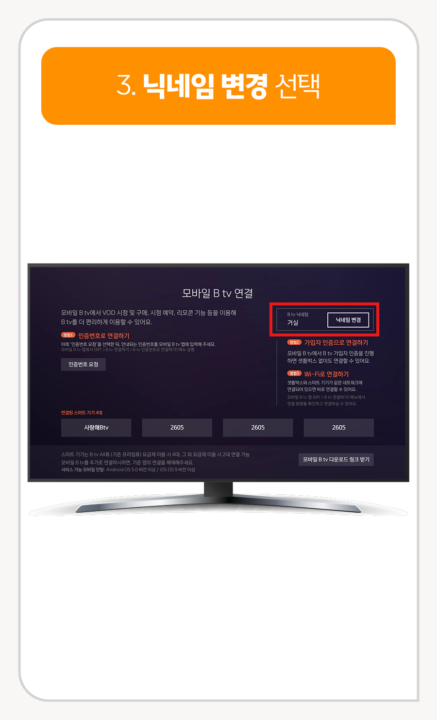 B tv 홈 ▶ MY ▶ 설정 ▶ 모바일 B tv 연결 ▶ 닉네임 변경