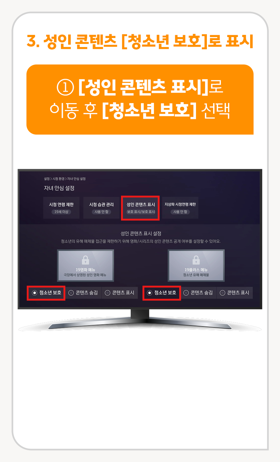 ① [성인 콘텐츠 표시]로 이동 후 [청소년 보호] 선택