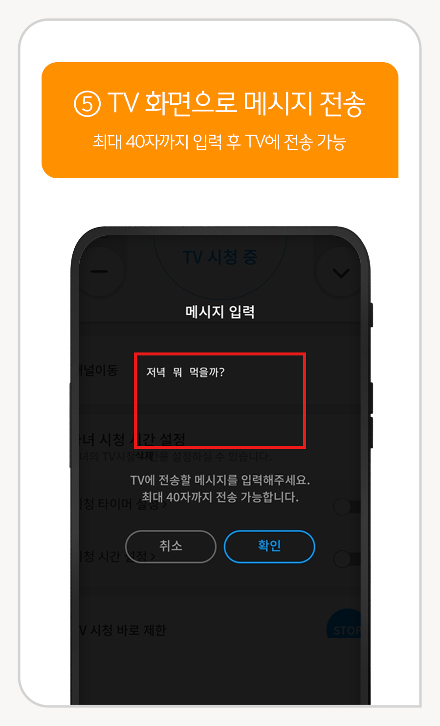 ⑤ TV 화면으로 메시지 전송 : 최대 40자까지 입력 후 TV에 전송 가능