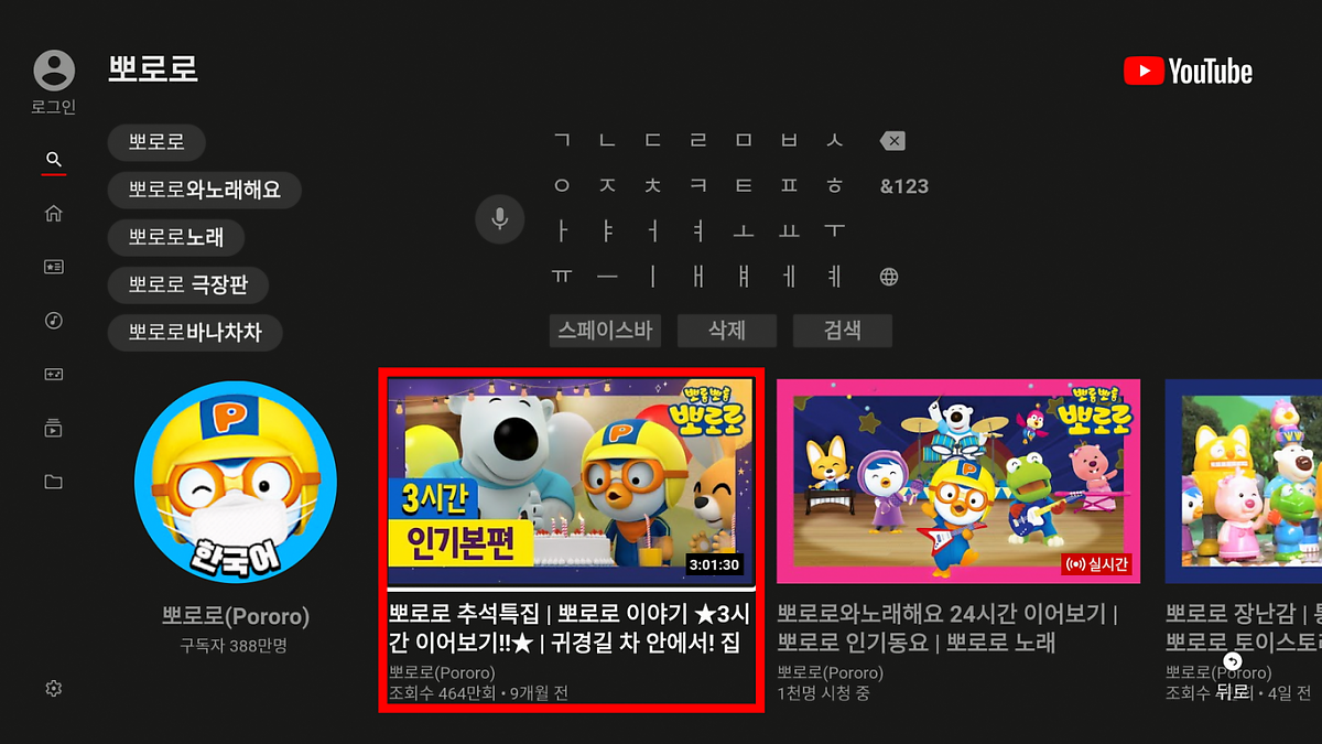 2. 리모컨의 방향키를 이용하여 검색으로 이동 시, 검색 화면과 키패트 입력창이 나타납니다.