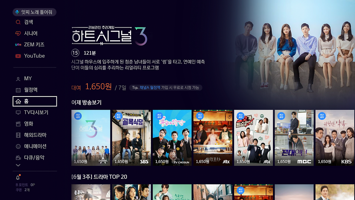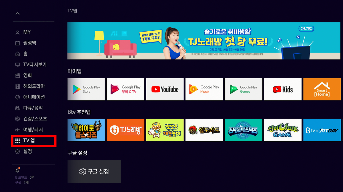 2. B tv 리모컨 홈 버튼을 누르면 홈 화면이 나타납니다.